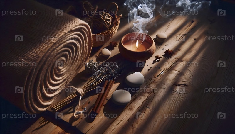 Плоская композиция угловой йоги-матки с терракотной свечой и дымовыми следами в теплом закате на дереве, Ai generated image