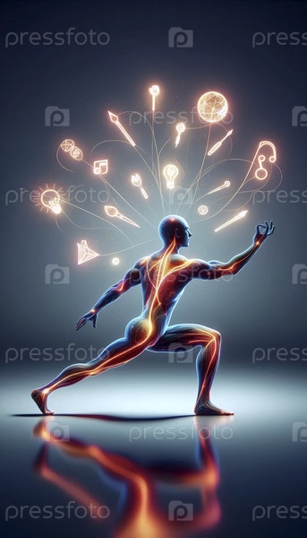 Практикующий йогу в широком воине II позирует с неоновым контуром и плавающими символическими идеями, Ai generated image