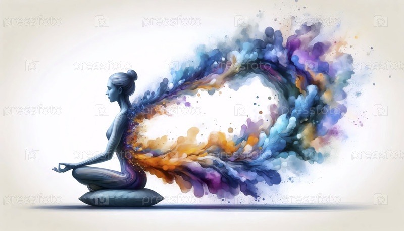 Практикующий йогу в сидячем виде растворяется в текущей абстрактной акварели творческая энергия, Ai generated image