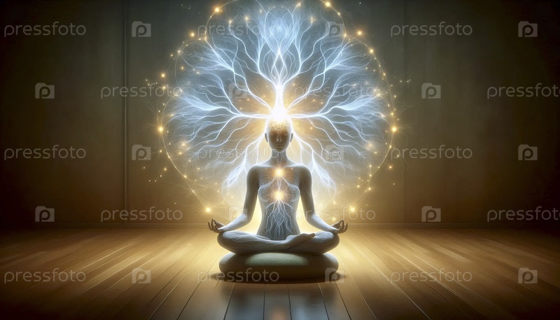 Нейрофитнес-практикующий с сияющими нейронными сетями вокруг головы во время сидячей медитации, Ai generated image