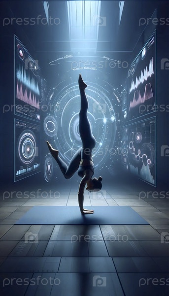 Умный практикующий йогу в головном положении с голографическими показаниями, показывающими баланс сердечного ритма и мышечную активацию, Ai generated image
