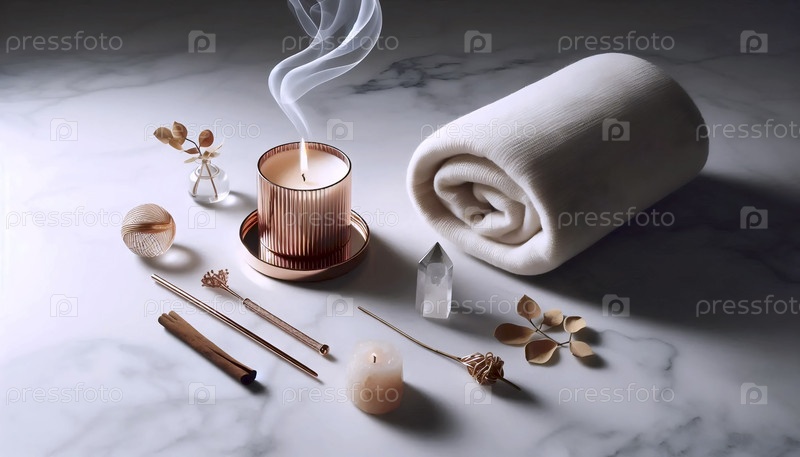 Плоская композиция реквизитов йоги со свечой из розового золота и спиральным дымом фимиама на мраморной поверхности, Ai generated image