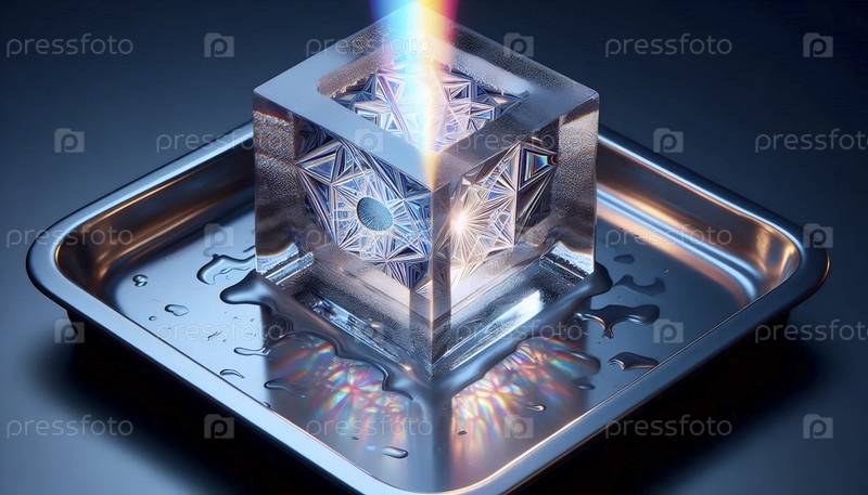Топящийся голографический кубик льда на серебряной подносе, расщепляющий свет в радугу внутри своей формы, Ай создал изображение