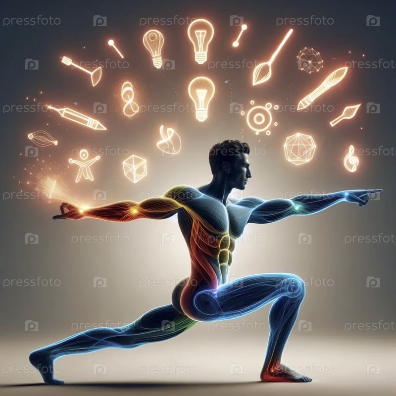 Практикующий йогу в широком воине II позирует с неоновым контуром и плавающими символическими идеями, Ai generated image