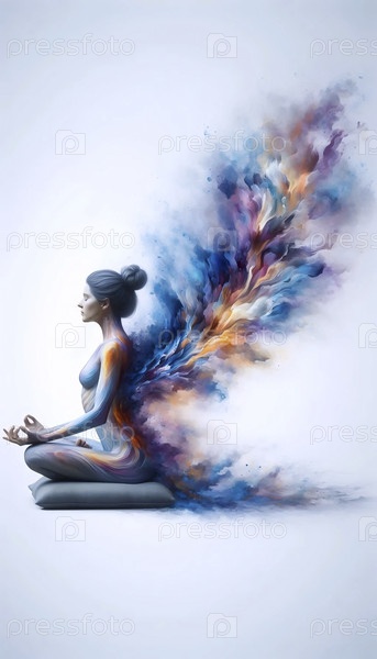 Практикующий йогу в сидячем виде растворяется в текущей абстрактной акварели творческая энергия, Ai generated image