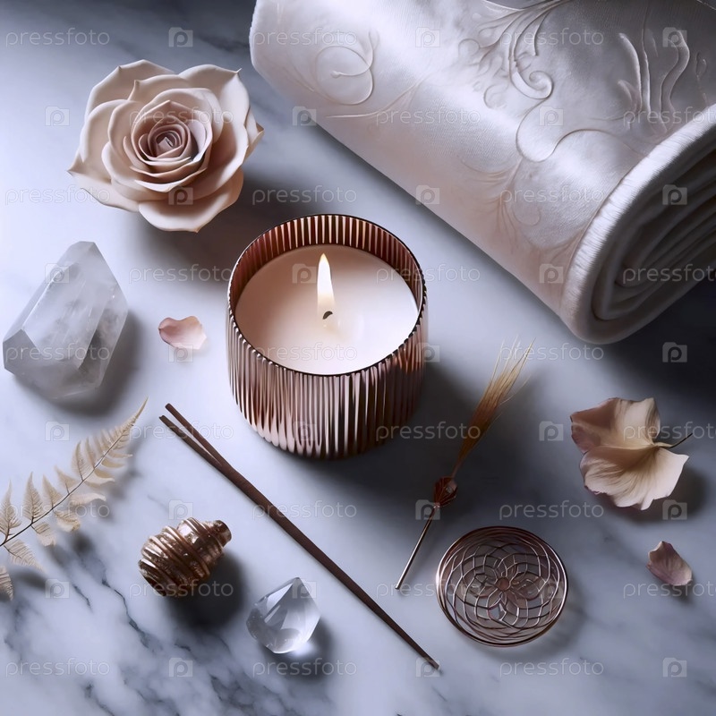 Плоская композиция реквизитов йоги со свечой из розового золота и спиральным дымом фимиама на мраморной поверхности, Ai generated image
