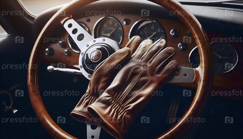 Пара кожаных водительских перчаток, обтянутых над рулем старого спортивного автомобиля, Ai generated image