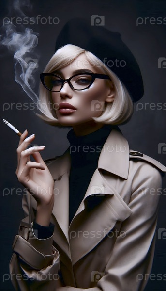 Модель в куртке и берете, держащая сигарету на длинном носителе, дым, изгибающийся вверх, Ai generated image