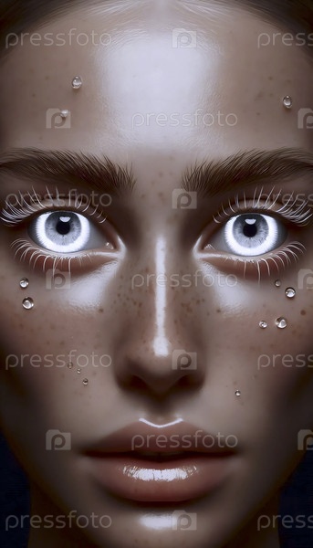 Зеркальная серебряная пленка на веках, отражающая кольцевые круги вспышек, с розовыми ресницами, Ai generated image