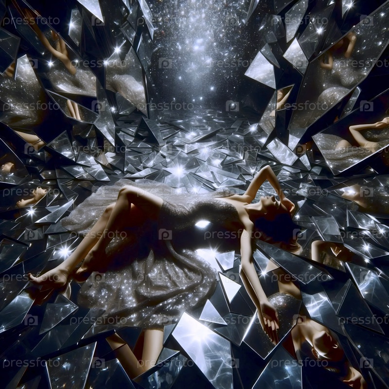 Женщина в полотном платье, лежащая на полу из разбитых зеркал, отражающих ее тысячу раз, Ai создала образ