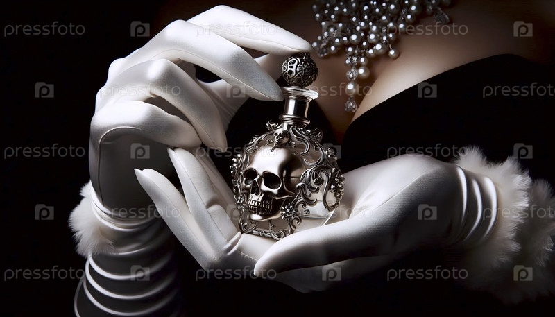 Ближайший план женских рук в оперных перчатках, один держит деликатную ядовитую бутылку, Ai generated image
