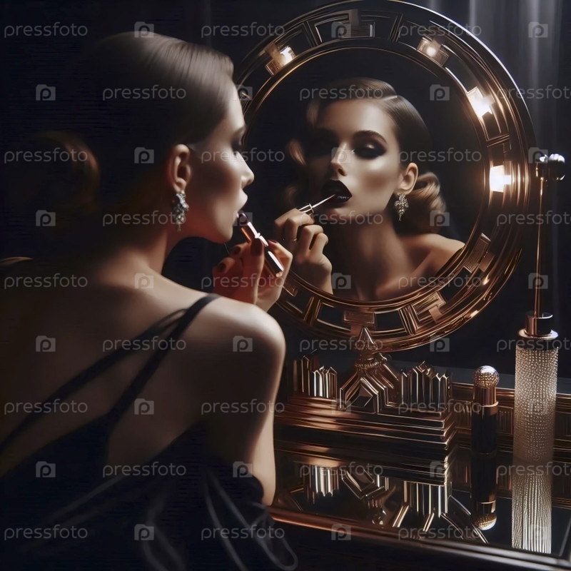 Женщина, отраженная в зеркале суеты арт-деко, наносит темную помаду, лицо наполовину в тени, Ai generated image
