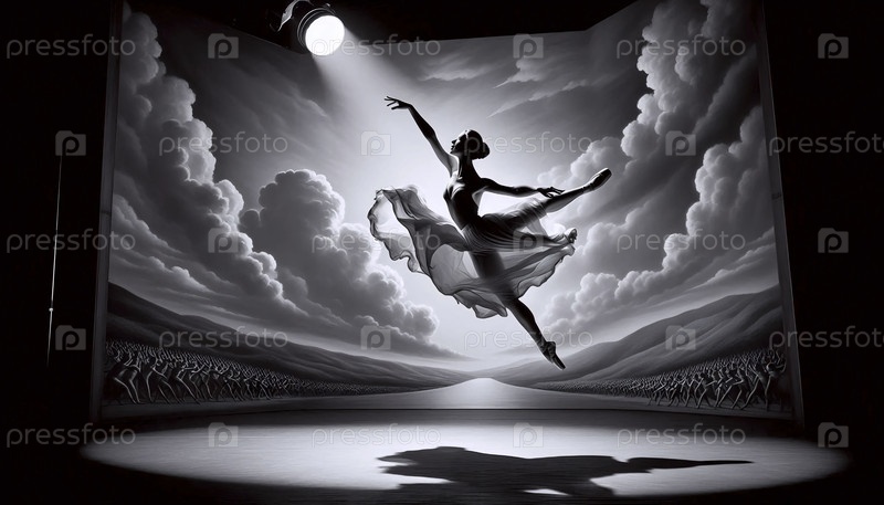 Танцовщица, застывшая в середине прыжка, захваченная вспышкой молнии на окрашенном облачном фоне, Ай создала изображение