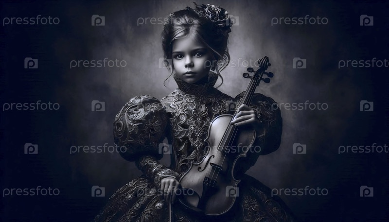 Чудо-ребенок, серьезная молодая девушка в праздничном платье, держащая скрипку, освещенная как дива, Ai generated image
