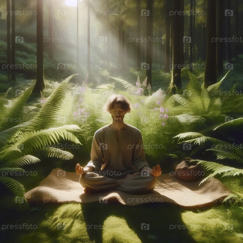 Практикующий эко-йогу сидит в медитации на естественном ютовом ковре в солнечном лесу, окруженный папоротниками, Ai generated image