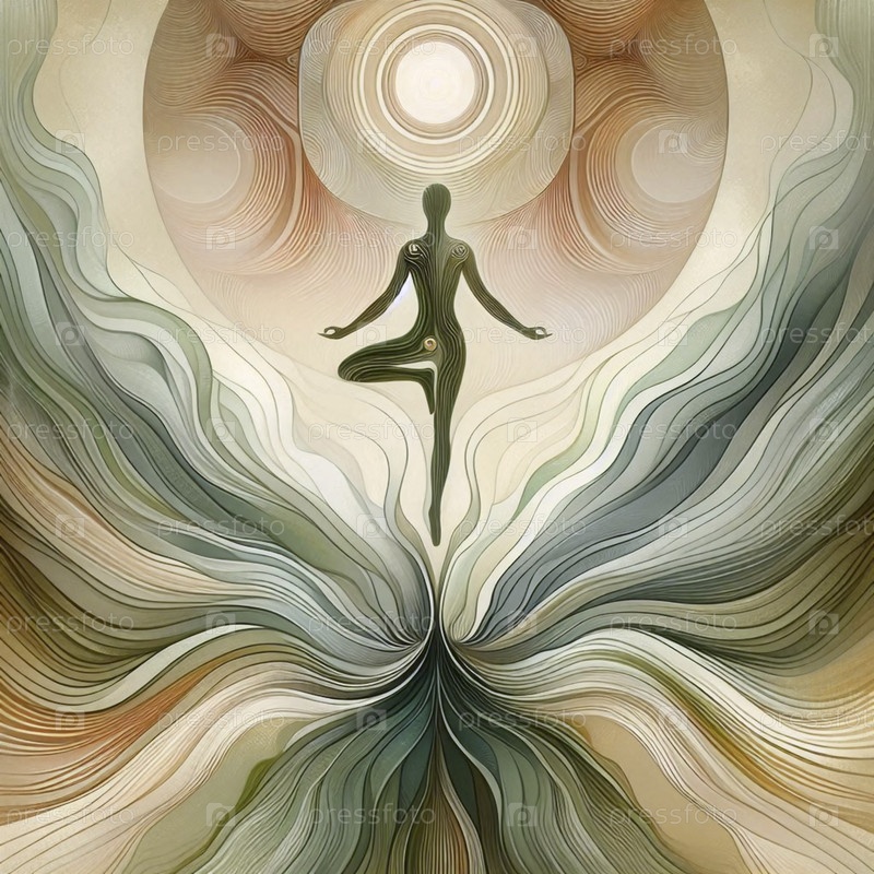 Абстрактная геометрическая композиция йоги из деревянной позы с органически текучими линиями, сливающимися в круговые медитативные узоры, Ai generated image