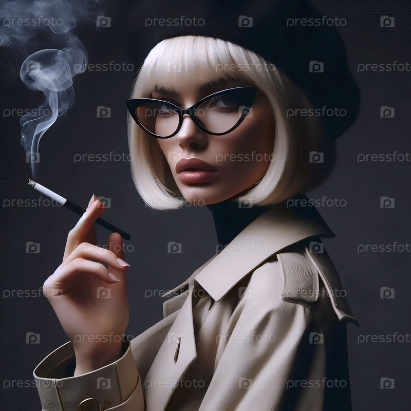 Модель в куртке и берете, держащая сигарету на длинном носителе, дым, изгибающийся вверх, Ai generated image
