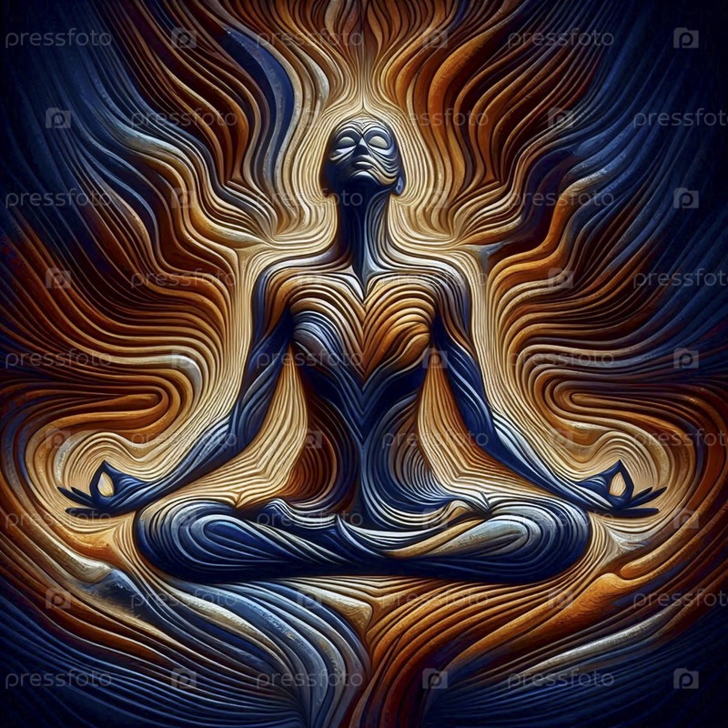 Абстрактная геометрическая композиция йоги с человеческим силуэтом, растворяющаяся в терракотно-синих и золотых тесселяциях, Ai generated image