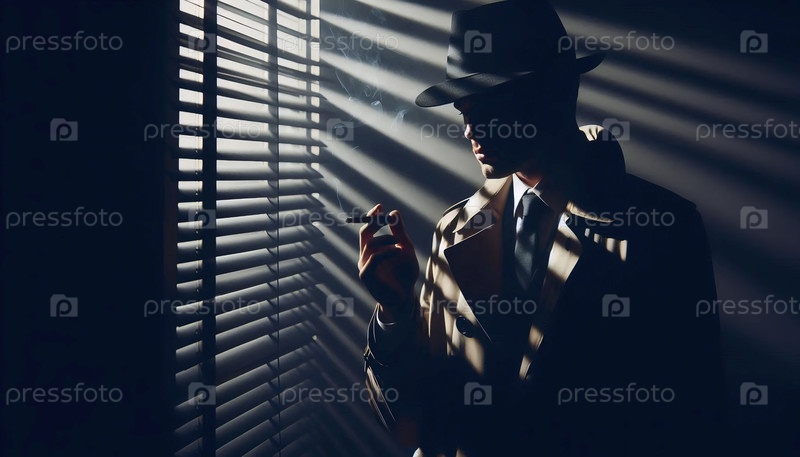 Мужчина в федоре, освещенный сзади шаблоном жалюзи для окон, лицо во тьме за исключением сигаретного фонаря, Ai generated image