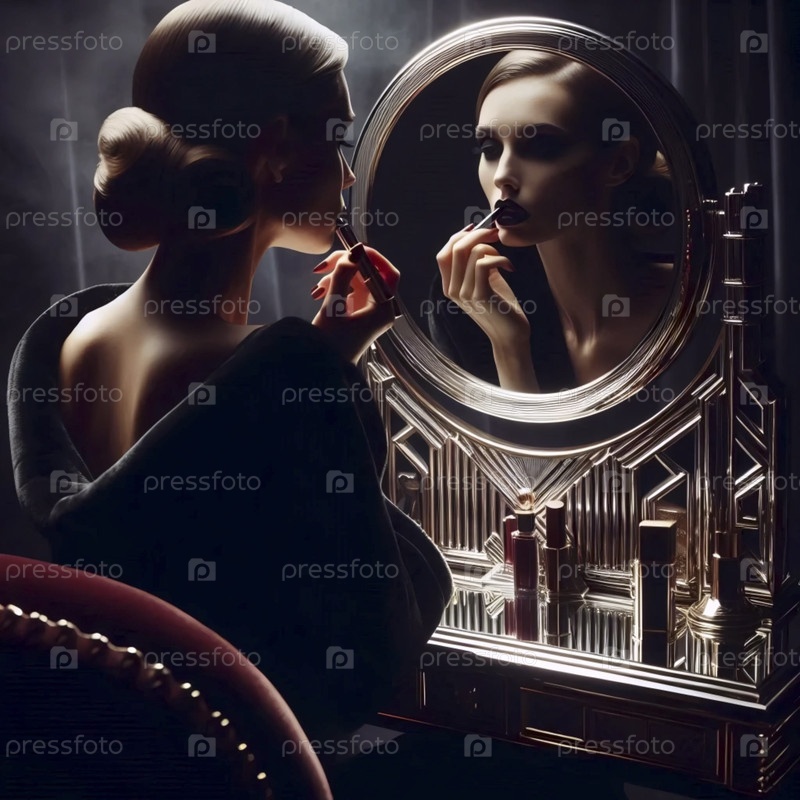 Женщина, отраженная в зеркале суеты арт-деко, наносит темную помаду, лицо наполовину в тени, Ai generated image
