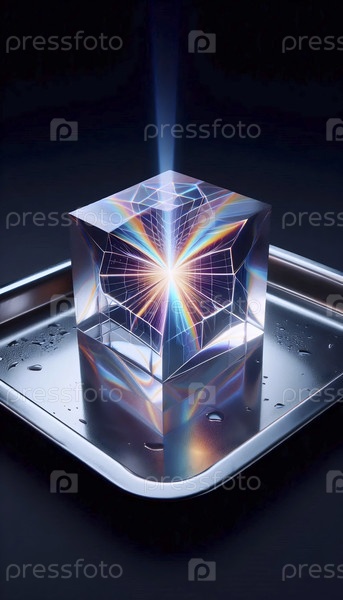 Топящийся голографический кубик льда на серебряной подносе, расщепляющий свет в радугу внутри своей формы, Ай создал изображение