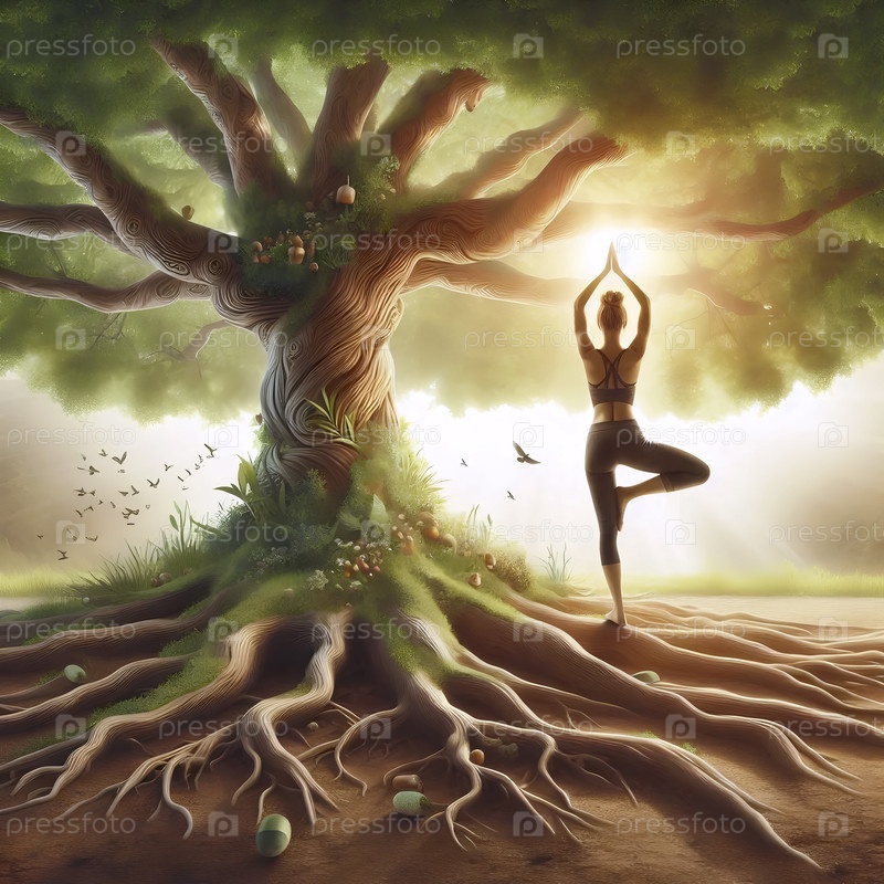 Практикующий йогу в позе дерева превращается в могущественный дуб с корнями, текущими из ног и ветвями от рук, Ai generated image