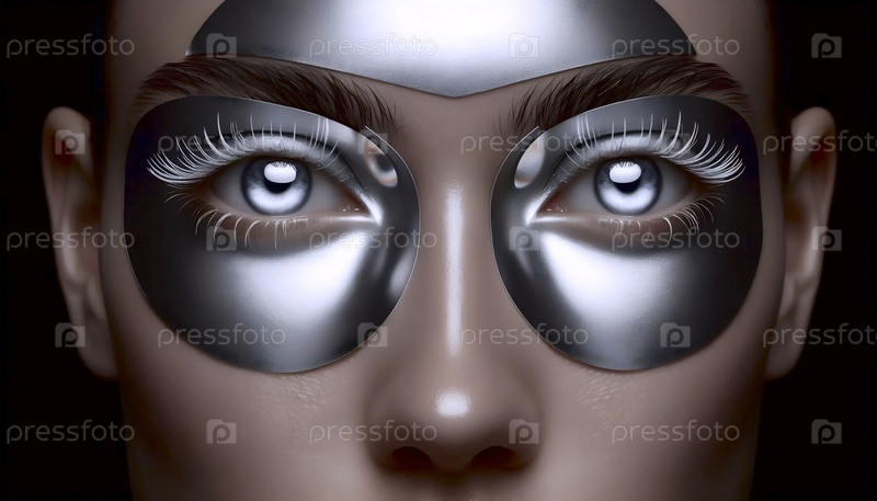 Зеркальная серебряная пленка на веках, отражающая кольцевые круги вспышек, с розовыми ресницами, Ai generated image