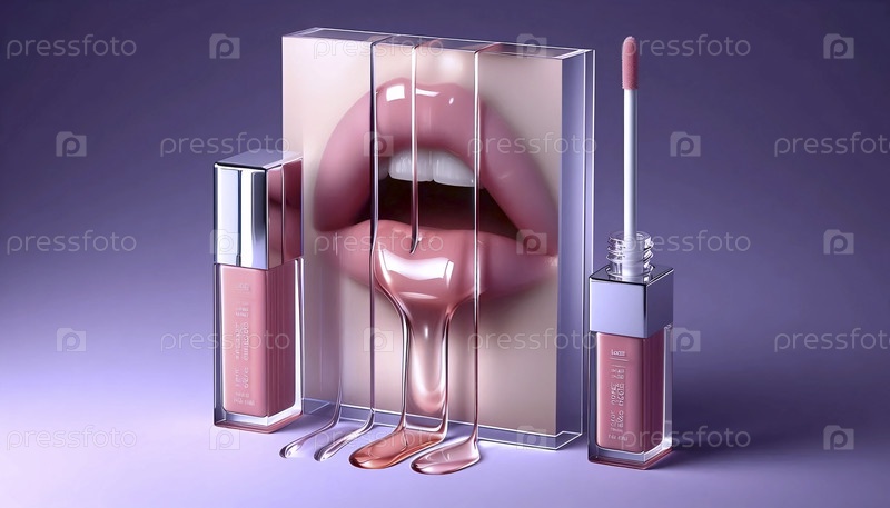 Вертикальный ряд горшков с блеском на губах с вырезанной вертикальной полосой, показывающей глянцевые губы в действии, Ai generated image