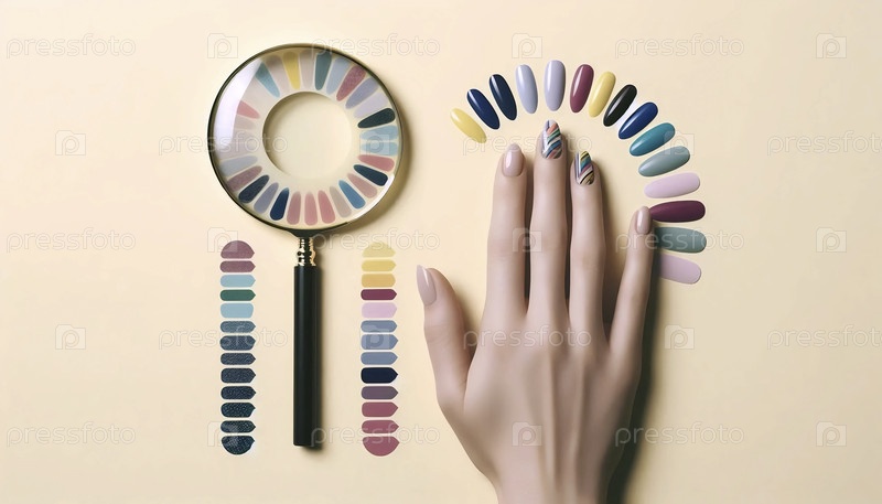Графический плоский набор полос ногтевого лака рядом с рукой, а вырезанное увеличительное стекло показывает идеальное применение, Ai создал изображение
