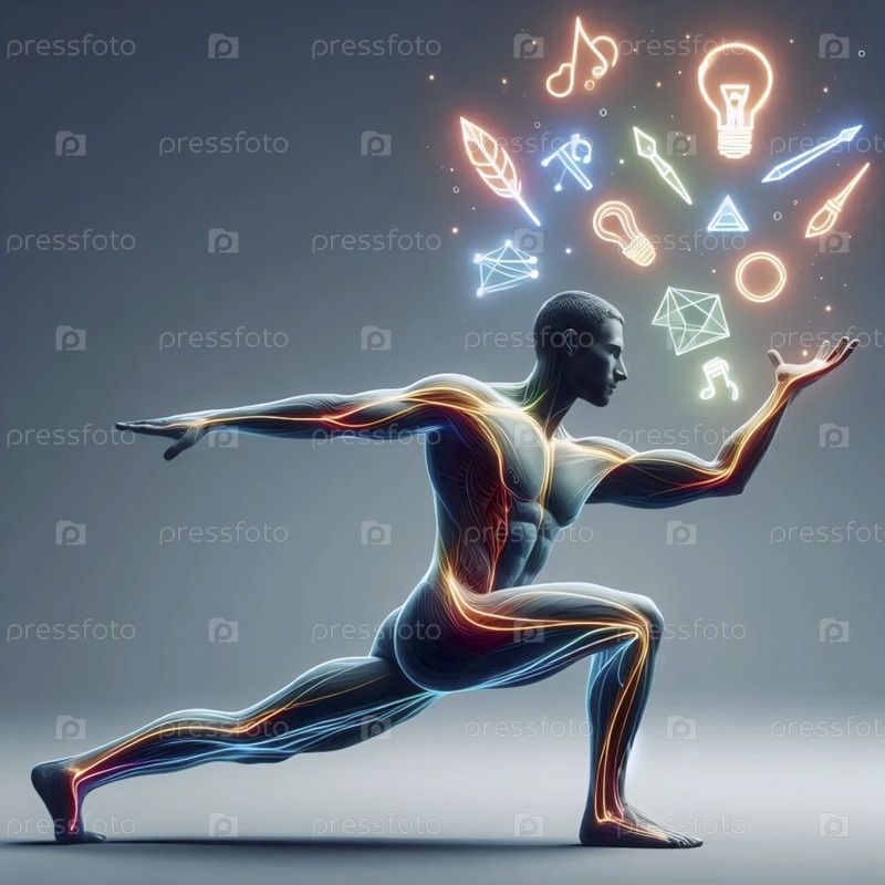 Практикующий йогу в широком воине II позирует с неоновым контуром и плавающими символическими идеями, Ai generated image