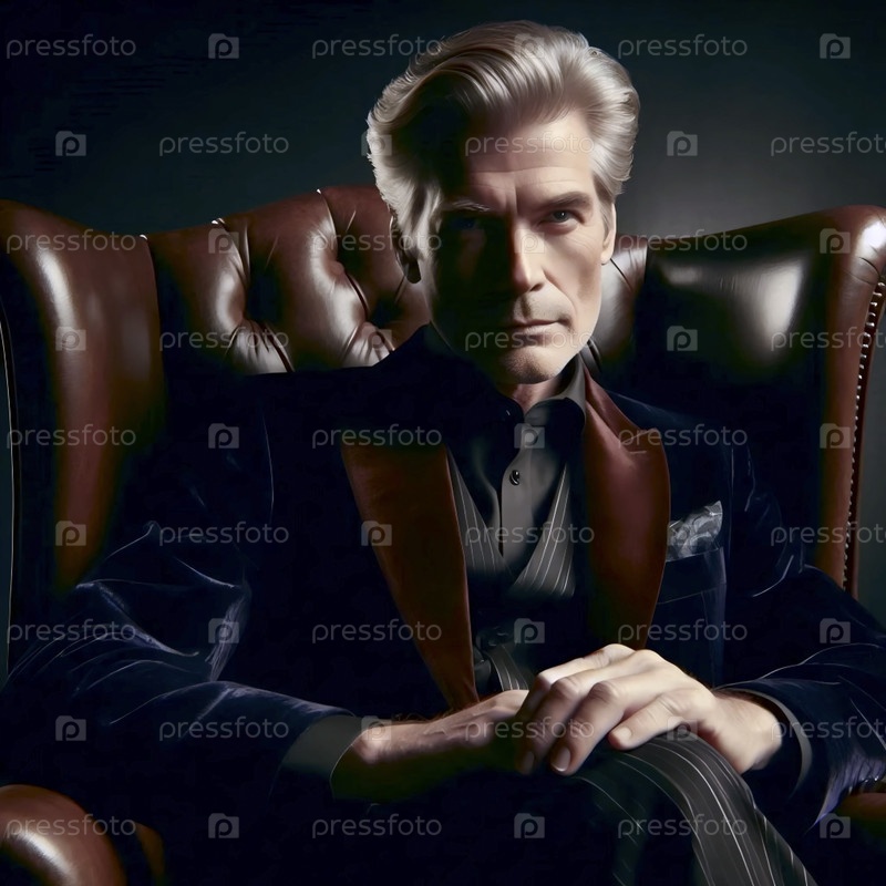 Серебряноволосый магнат в курильной куртке, смотрящий на объектив с ледяным спокойствием, Ай создал изображение