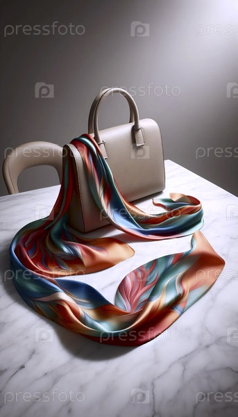 Шелковый шарф, связанный вокруг ручки классической кожаной сумочки, снятый на мраморной поверхности, Ай создал изображение