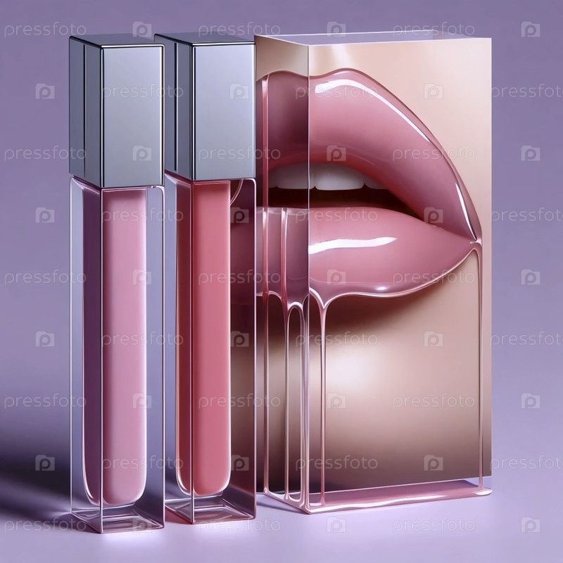 Вертикальный ряд горшков с блеском на губах с вырезанной вертикальной полосой, показывающей глянцевые губы в действии, Ai generated image