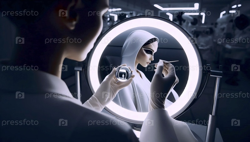 Вид над плечом модели в белом пальто, наносящей капли росы пинцетом, увиденный в зеркале, Ai generated image
