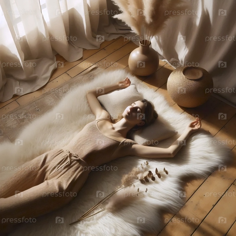 Мягкий практик оздоровления, лежащий в savasana на пушистом ковре из овечьей шкуры с утренним светом и высушенными цветами, Ai generated image