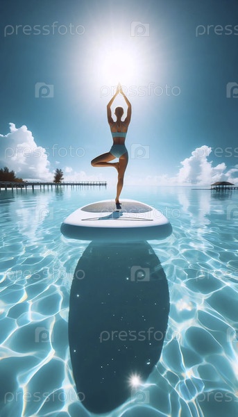Практикующий йогу SUP в идеальной деревянной позе на подлодке плавает над кристально чистой бирюзовой водой, Ai generated image