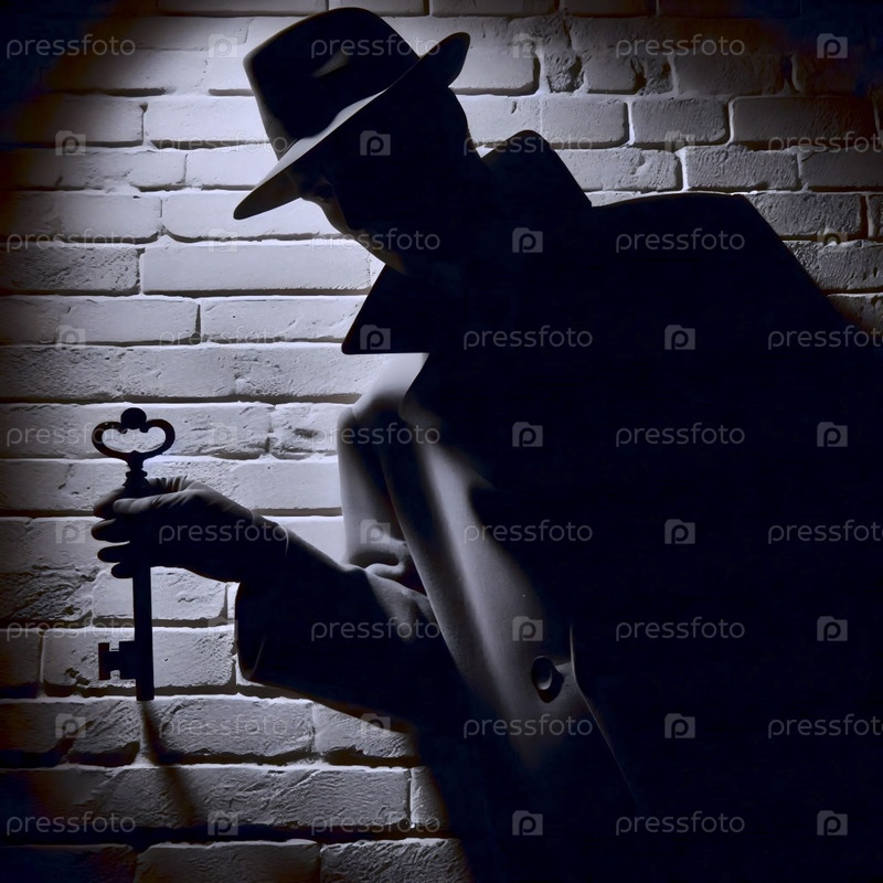 Тень человека в шляпе и пальто, большая на кирпичной стене, видна только его настоящая рука с ключом, Ai generated image