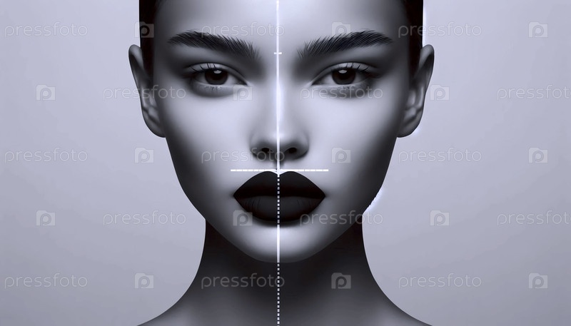 Симметричный портрет модели с параллельными белыми линиями, проведенными по губам и под глазами, Ai создал изображение