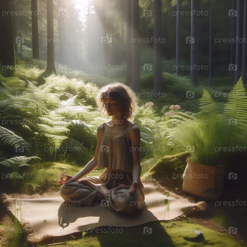 Практикующий эко-йогу сидит в медитации на естественном ютовом ковре в солнечном лесу, окруженный папоротниками, Ai generated image