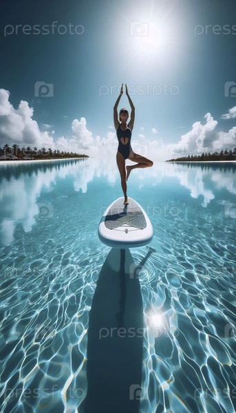 Практикующий йогу SUP в идеальной деревянной позе на подлодке плавает над кристально чистой бирюзовой водой, Ai generated image