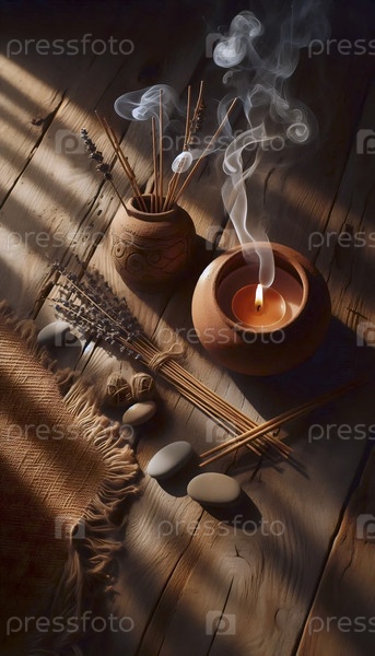Плоская композиция угловой йоги-матки с терракотной свечой и дымовыми следами в теплом закате на дереве, Ai generated image