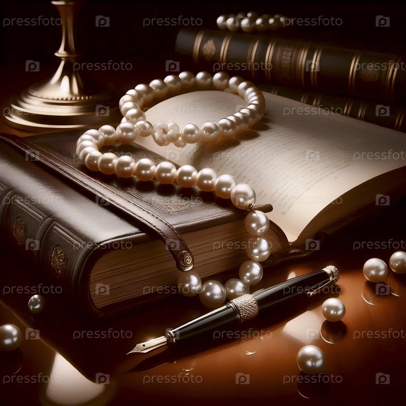 Шнурок жемчуга, застрявший на страницах кожаной книги на столе, Ай создал изображение