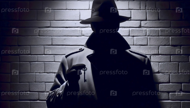 Тень человека в шляпе и пальто, большая на кирпичной стене, видна только его настоящая рука с ключом, Ai generated image