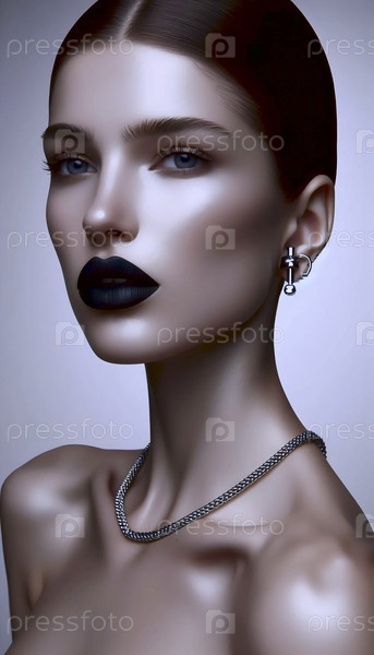 Нежная серебряная цепь, растянутая от геометрических черных губ до лобового уха, портрет красоты, Ai generated image