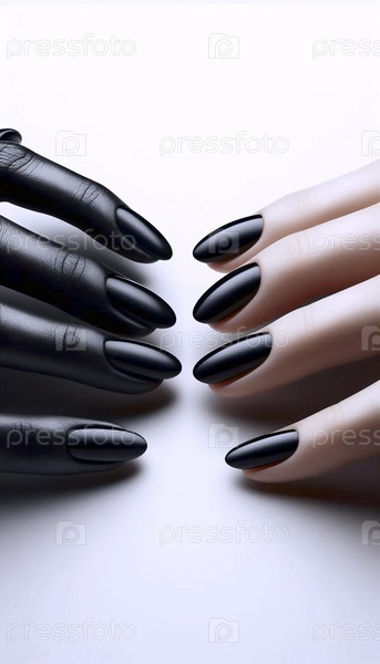 Две руки, касающиеся кончиков пальцев, контрастирующие матовый бархат и глянцевые черные ногти, Ai generated image
