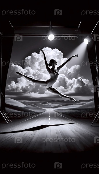 Танцовщица, застывшая в середине прыжка, захваченная вспышкой молнии на окрашенном облачном фоне, Ай создала изображение