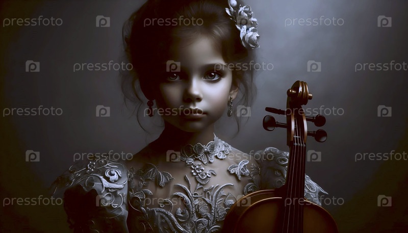 Чудо-ребенок, серьезная молодая девушка в праздничном платье, держащая скрипку, освещенная как дива, Ai generated image