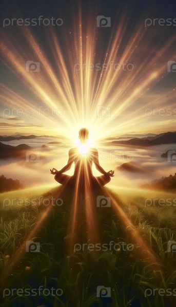 Практикующий йогу в лотосной позе с сияющим светом, исходящим из сердца и сливающимся со золотым восходом солнца в туманном пейзаже, Ai generated image