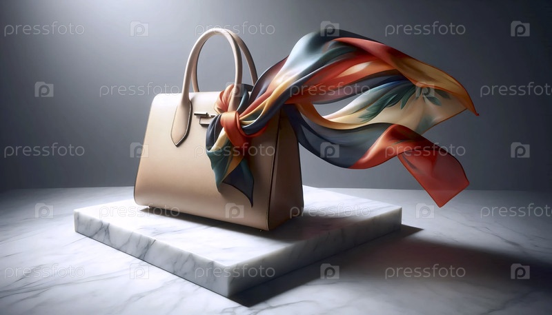 Шелковый шарф, связанный вокруг ручки классической кожаной сумочки, снятый на мраморной поверхности, Ай создал изображение