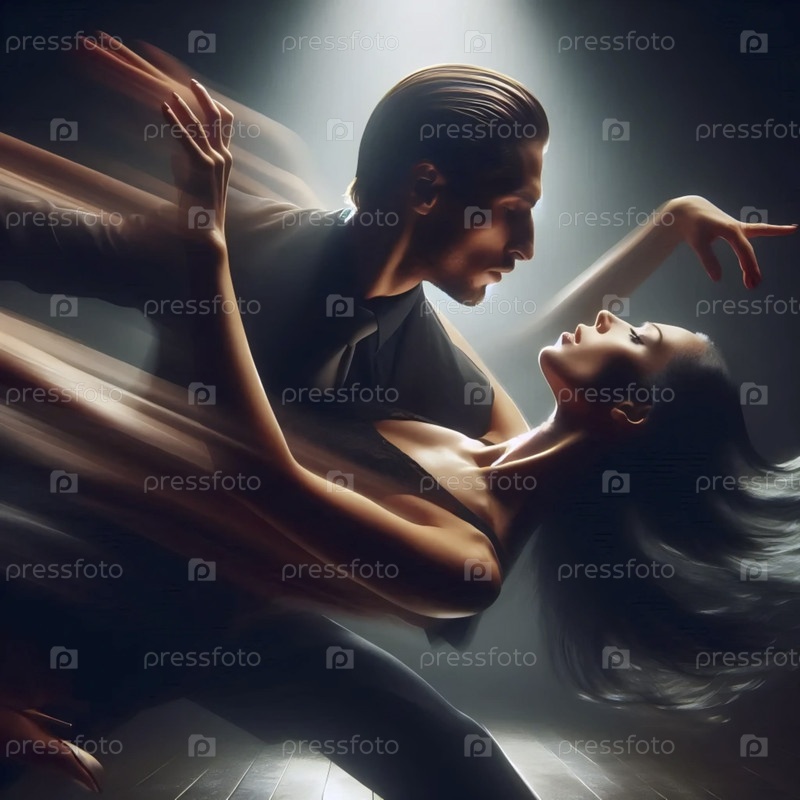 Пара танцует танго, движение размытое, но их интенсивные лица резко освещены и сфокусированы